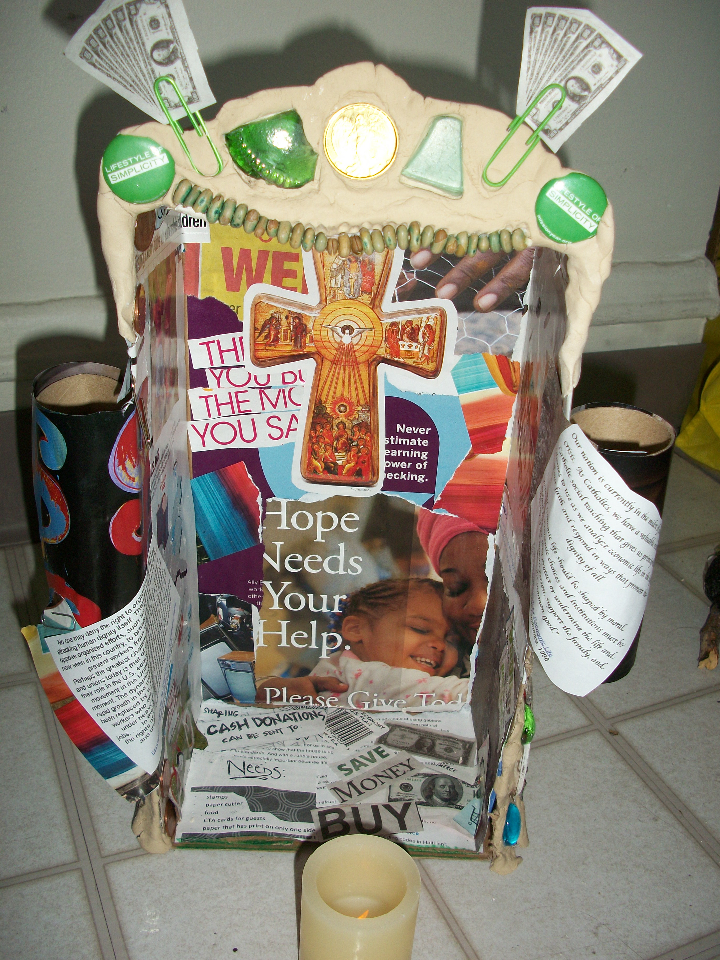 The main art project that has consumed my time and energy was building mini-grottos to pray for issues of peace and justice. These diorama-type shrines will be prayed with by my community during our Education Week gathering this week. The justice and peace committee that I am a part of hopes to increase consciousness, conversation and prayer around the issues of immigration, food, economics, education, church and health care. Here’s a preview of the art for all the sisters and affiliates who read this blog: