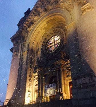 We pulled up to the Cathedral of St. Paul during the evening Ash Wednesday service, gathered our equipment, took a deep breath and were off. We ran up the stairs and leaned extension ladders on the two large marble pillars framing the cathedral’s front door. Two Catholic Workers ascended the ladders and hung a large banner reading “Speaking up for unborn lives more than black and brown lives is white supremacy – #silenceissin” across the door, calling on Church hierarchy to condemn racism and xenophobia with as much tenacity and consistency as it does abortion.