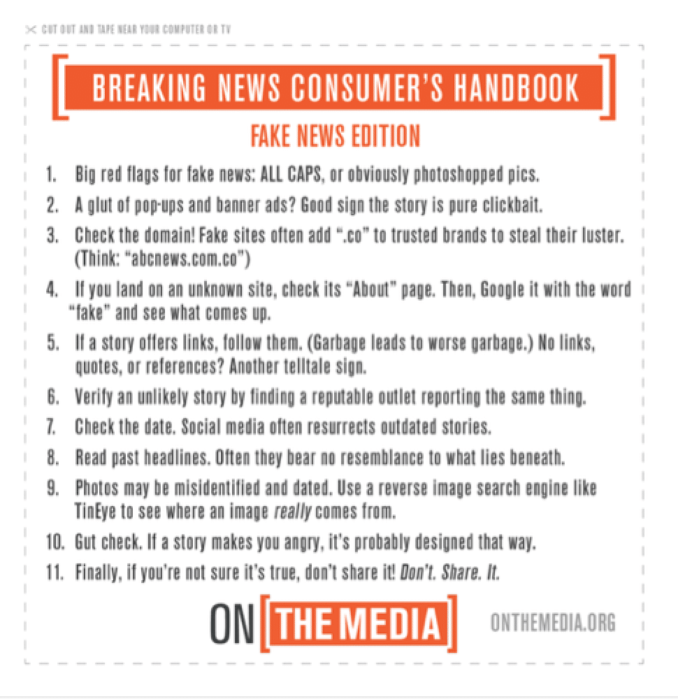 I am growing increasingly convinced that anyone who consumes information in this modern world has a civil duty to develop their skills and critical reading eye. For example, I like how On The Media suggests we spot Fake News.