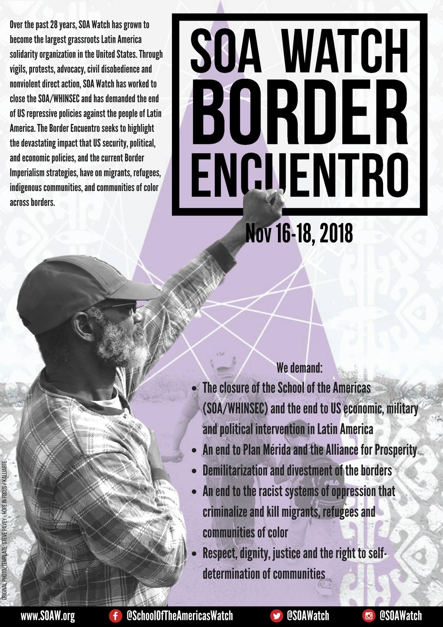 “Our move to the border responds to the present-day call to solidarity in Latin America. The mobilization at the border in Nogales is one more way to fight for the closure of the School of the Americas/WHINSEC and an end to U.S. intervention in Latin America. The third bi-national Encuentro at the militarized U.S./Mexico border aims to build the grassroots power necessary to challenge the racist statutes quo and push back against U.S. intervention in Latin America.”