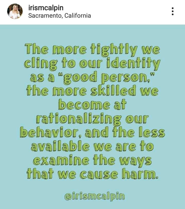 In effect, when we hold so tightly to our good intentions as a means to silence any feedback on our own violence, we weaponize them. We wield the weapon of good intentions in self-defense in order to protect our own self-image, our comfort and our conscience.