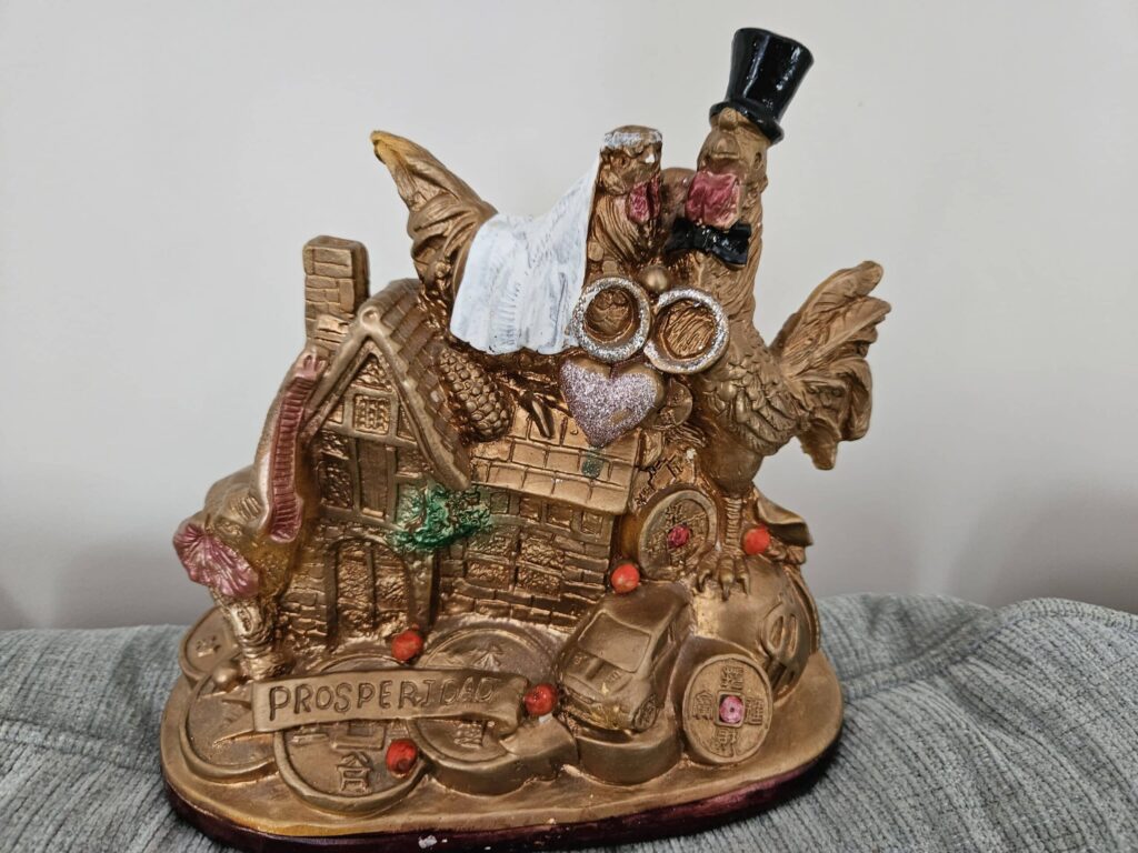 Without my seeing, Ángel and Ely purchased their desire for me, a gold painted statue montage like none other: A huge house and car resting on top of a pile of coins with a chicken and rooster in wedding attire perched on top of the roof. “Prosperidad” read the banner at the bottom. Did I blink in wonderment, or to keep the tears at bay? Where I only dared hope to mitigate future disaster, they could see a bright future for me. Moreover, they believed I deserved it and weren’t afraid to ask for it on my behalf. Before I could refuse, they sat me down in front of an indigenous priest, who blessed the object – and me. Incense rose; confetti fell. “Buen hora,” he said, looking into my eyes. “Godspeed. Blessings on the journey ahead.”