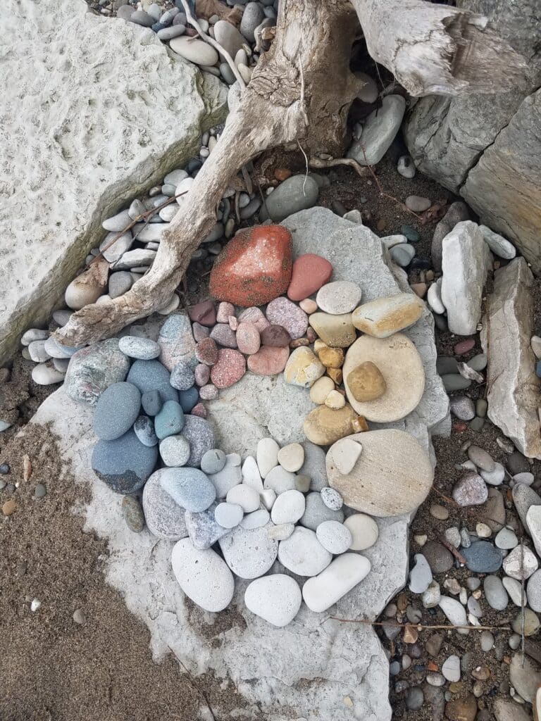 I feel the expansiveness of time and space, the freedom of solitude of the shore. I desire to reverence the beauty of many small stones collected in one space, to honor the sacredness. I sort stones by color. I decide to make something, like an offering of thanks, a gift to the next guest to the sacred space. I lose track of time as I create a circle of stones, a color wheel, and delight in the joy of creating something beautiful. I sing and pray out loud. I stroll down the shore, slowly picking up rocks, feeling their temperature, firmness, then toss them into the lake, one by one. The ripples expand across the waves.