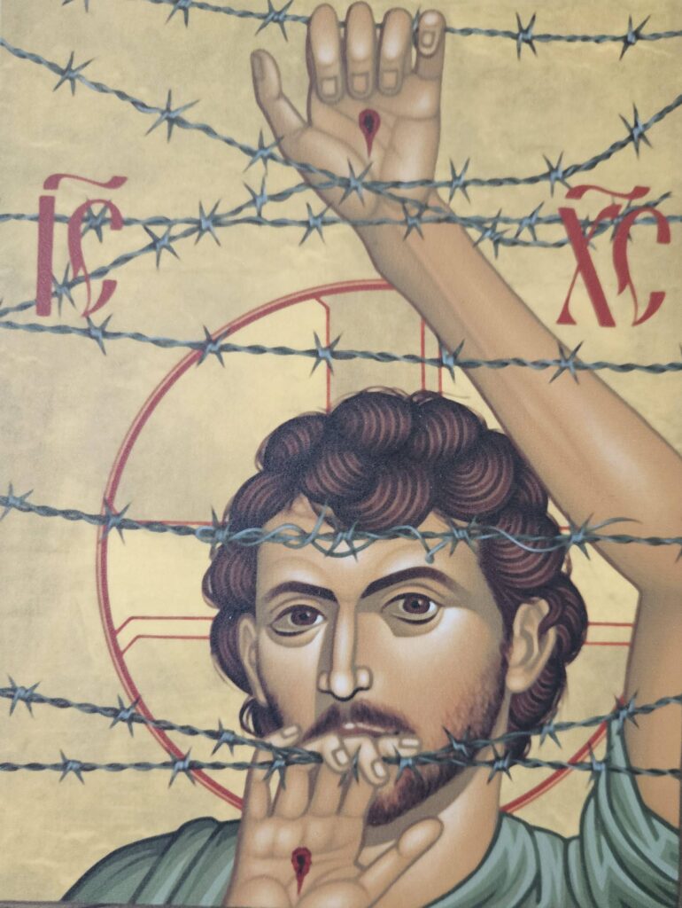 I am reminded of the icon Christ of Maryknoll, in which Jesus looks piercingly through barbed wire, a line of metal thorns across the crown of his head. His location is intentionally unclear. The artist, Brother Robert Lentz, OFM, has written, “Is he imprisoned or are we?…We and our institutions also try to imprison Christ in various ways, to tame him and the dangerous memories he would bring us of our goals and ideals.”