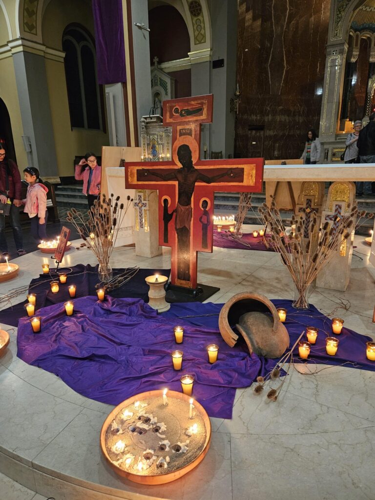 Once we plant our candles in bowls of sand encircling the altar, the music gradually gives way to silence. The worship aide reads,